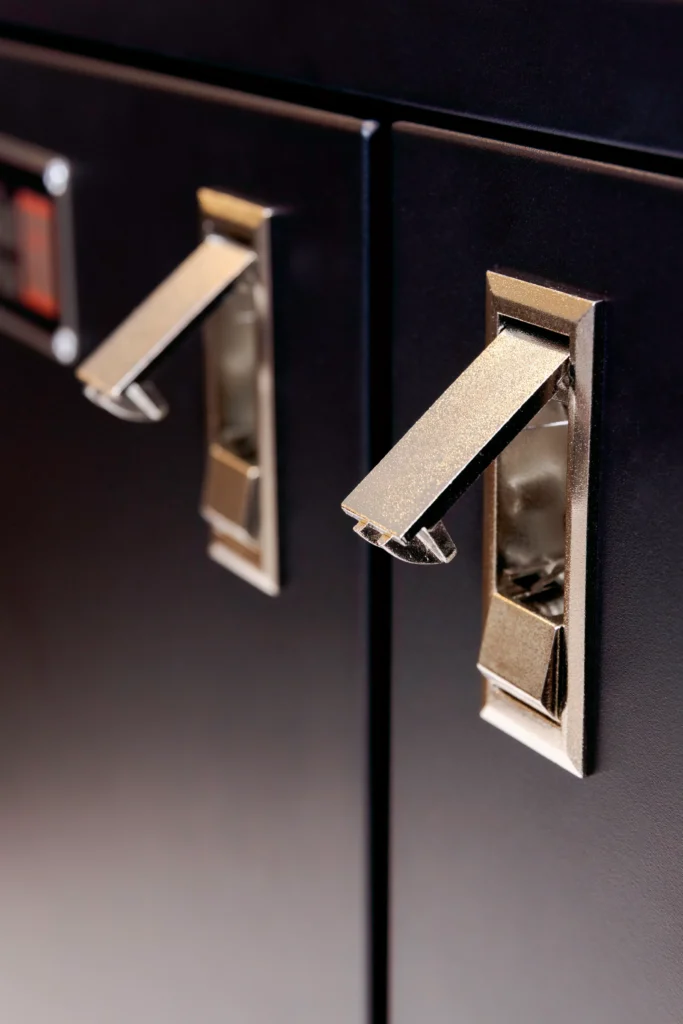 You adjust the bolt-action door handles using a screw inside each door. When properly adjusted, the handles lock firmly into place. Adjust them so that locking the doors requires light pressure—this ensures a tight seal that keeps the interior water-resistant.