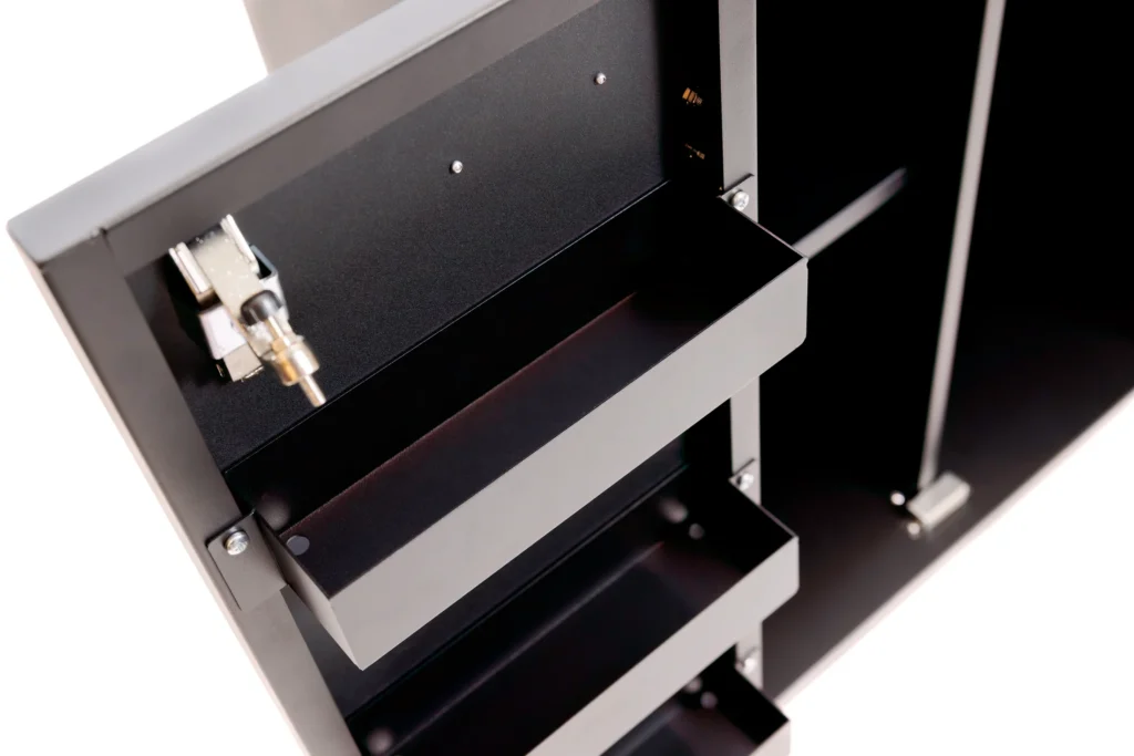 The main compartment is divided into left and right halves. Two adjustable shelves fit into notches along the sides, letting you choose your preferred shelf height. These shelves are great for storing food-safe gloves, grill baskets, foil for the Texas crutch, butcher paper, thermometers, wood chunks, and other small accessories. Beneath the shelves, there’s ample space for heavier bags of pellets, lump charcoal, or briquets.