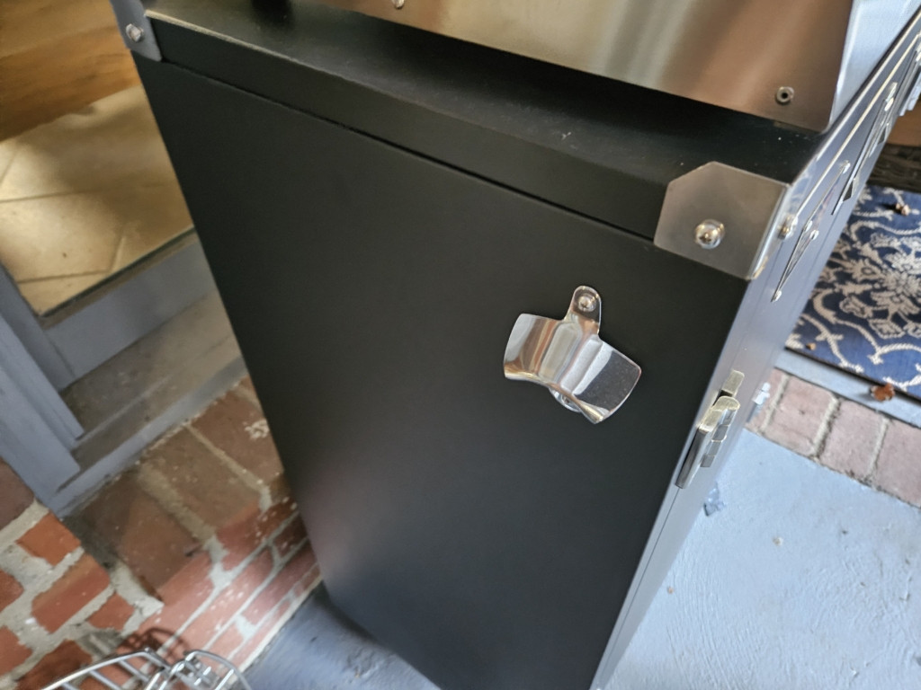 Additional features include a bottle opener mounted on the outer left wall and a towel holder on the right. For a future 3.0 version, a removable towel bar that could also hold a roll of paper towels would be a welcome upgrade. Until then, you can store paper towels inside.